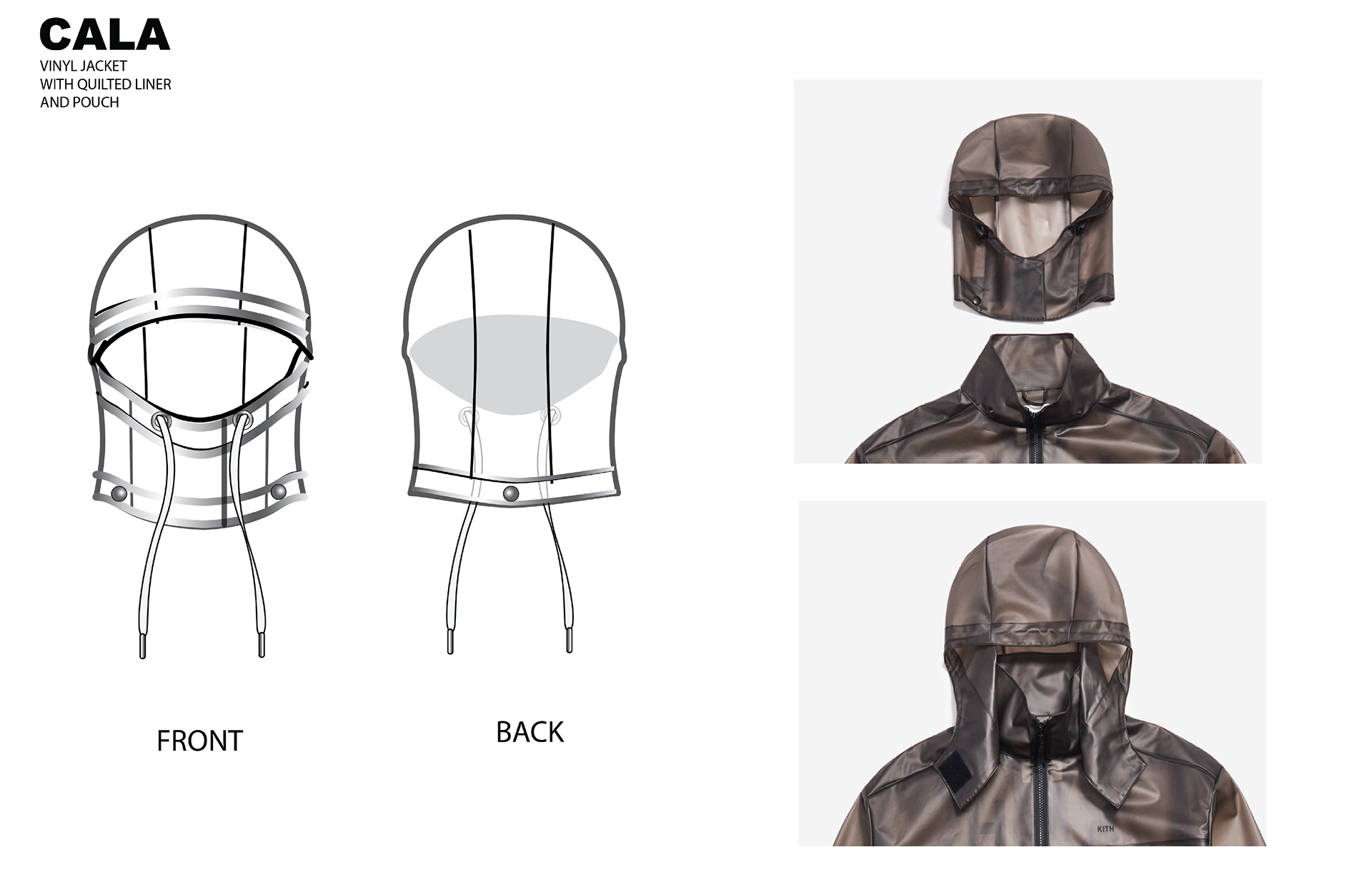 FULL COLOR DETAIL SKETCHES OF JACKET, HOOD, LINER AND STORAGE POUCH